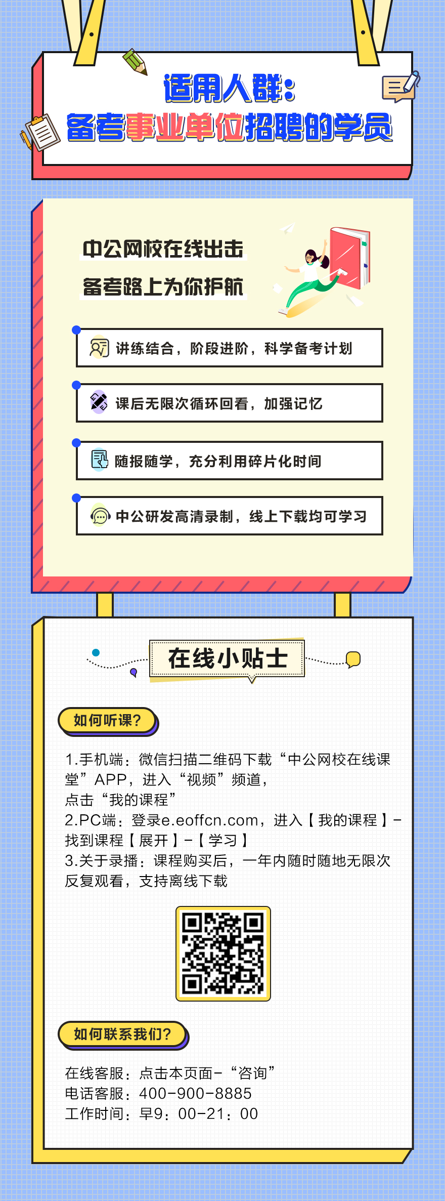 工作时间:课程咨询请按1(9:00-22:00),学员服务请按2(9:00-21:00),节假日不休